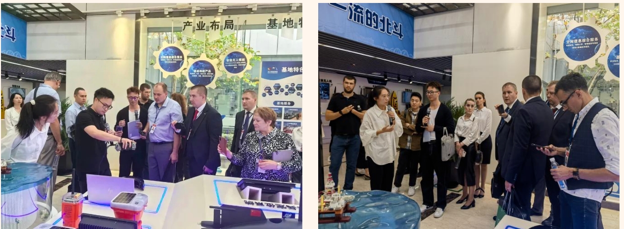 俄羅斯代表團一行首先來到基地展廳,參觀了北斗核心器件、終端產業、無人系統、空間大數據等產品和應用場景,了解了北斗衛星導航系統應用及產業發展情況。北斗西虹橋基地按照“一核兩翼”產業定位,積極打造基于專業化創新孵化支撐體系、具有全球影響力的北斗導航科創中心和產業生態圈。代表團一行還饒有興趣的體驗了智慧運動、數字健身和飛行模器等。