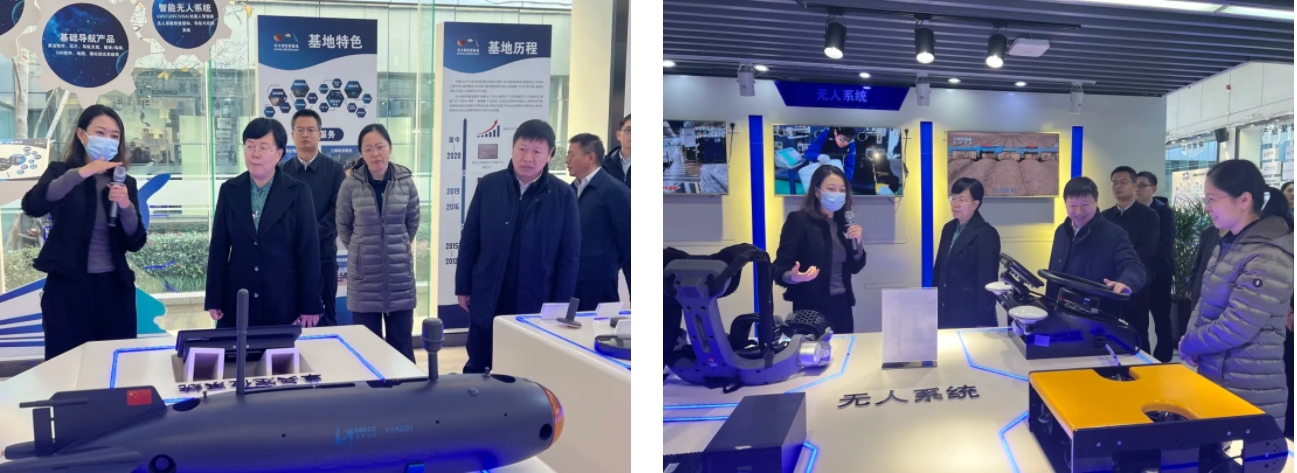 在基地展廳,調研團一行也參觀了北斗導航核心部件、終端產品、海洋應用、協同創新成果以及無人系統、空間大數據相關場景及產品,詳細了解了上海與長三角地區空間信息產業發展規劃,及北斗西虹橋基地發展歷程與未來戰略規劃等情況。